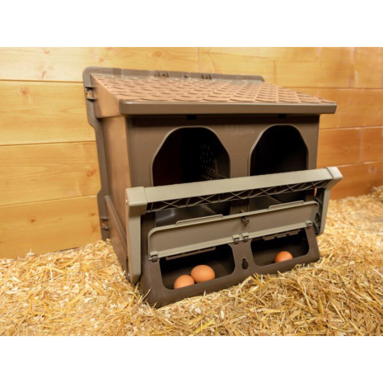 Plastično dvostruko gnijezdo za perad pruža nesilicama mirno i čisto mjesto za nesenje jaja u kokošinjcu. Unutarnja pregrada dijeli gnijezdo za nesilice na dva odvojena odjeljka, pa se kokoši lakše izmjenjuju i u gnijezdu je više reda. Ulaz se može zatvoriti preklopnom prečkom.