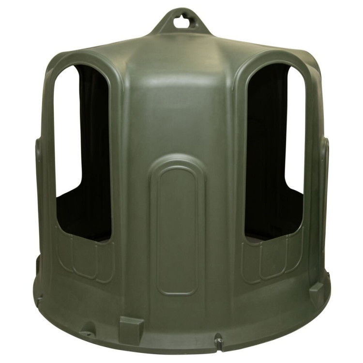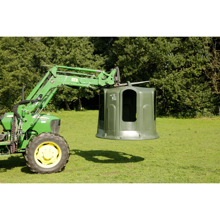 Plastično krmno zvono za hranjenje goveda i konja s okruglih bala sijena. Pet sigurnih hranidbenih otvora omogućuje životinjama udoban pristup, a stabilna konstrukcija drži zvono čvrsto na mjestu. Za vanjsku upotrebu izrađeno je od izdržljive plastike s UV zaštitom; iznad otvora ima odvodne kanale, a rukovanje olakšava integrirano uho za podizanje prilagođeno vilicama prednjeg utovarivača.