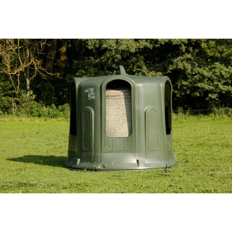 Kad trebate da hranilište ostane čvrsto na jednom mjestu, možete koristiti integrirana ušica za učvršćivanje u tlo. Za dodatnu zaštitu bale moguće je dokupiti dno (prodaje se zasebno), namijenjeno suhom skladištenju bale i koje se može zaključati za prijevoz sijena.