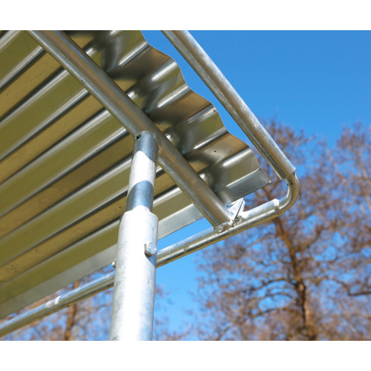 Za vanjsku upotrebu važna je izdržljiva zaštita površine. Hranilište je vruće pocinčano te ima 1 kvadratni cijevni oslonac. Isporučuje se kao kompletna konstrukcija, uključujući obodnu zaštitu ruba krova i tri sigurnosne kopče, pa je spremno za upotrebu bez sastavljanja.