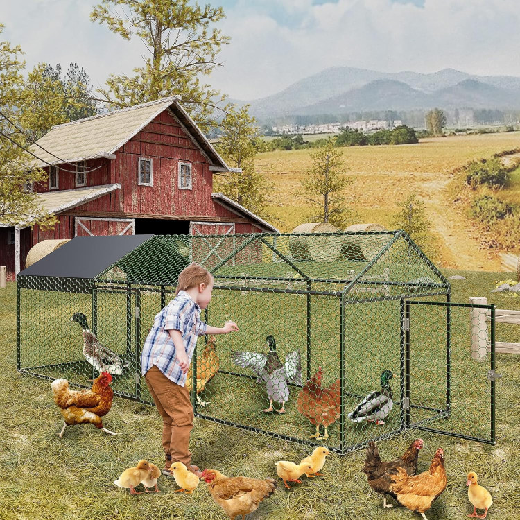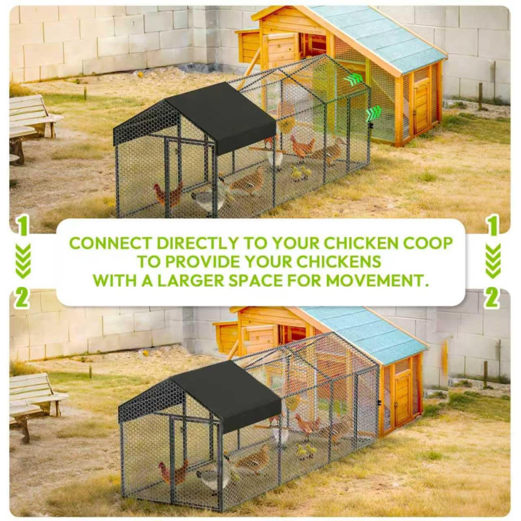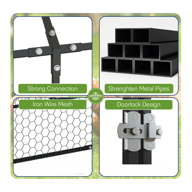 Prostrani metalni ograđeni prostor pruža vašim životinjama sigurno mjesto za kretanje po vrtu. Zahvaljujući čvrstoj konstrukciji, mreži i troja odvojena vrata, idealan je za svakodnevno držanje kokoši, pataka, zečeva i gusaka. Mogućnost izravnog spajanja na kokošinjac.