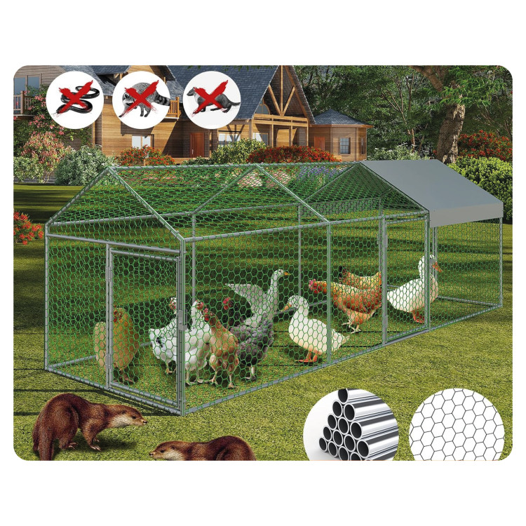 Prostrani metalni ograđeni prostor pruža vašim životinjama sigurno mjesto za kretanje po vrtu. Zahvaljujući čvrstoj konstrukciji, mreži i troja odvojena vrata, idealan je za svakodnevno držanje kokoši, pataka, zečeva i gusaka. Mogućnost izravnog spajanja na kokošinjac.
