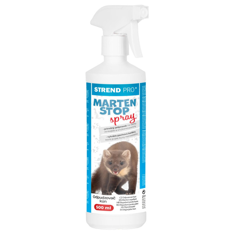 Strend Pro MARTEN STOP je visoko učinkovit sprej namijenjen zaštiti od kuna. Baziran je na posebnim aromatičnim komponentama koje su neprimjetne za ljude, ali vrlo neugodne za kune. Nakon nanošenja stvara zaštitni sloj otporan na toplinu i vremenske uvjete, što osigurava dugotrajnu zaštitu. Pogodan za upotrebu na plastičnim dijelovima, zaštićenim električnim sustavima, u kući, na tavanima i u garažama.